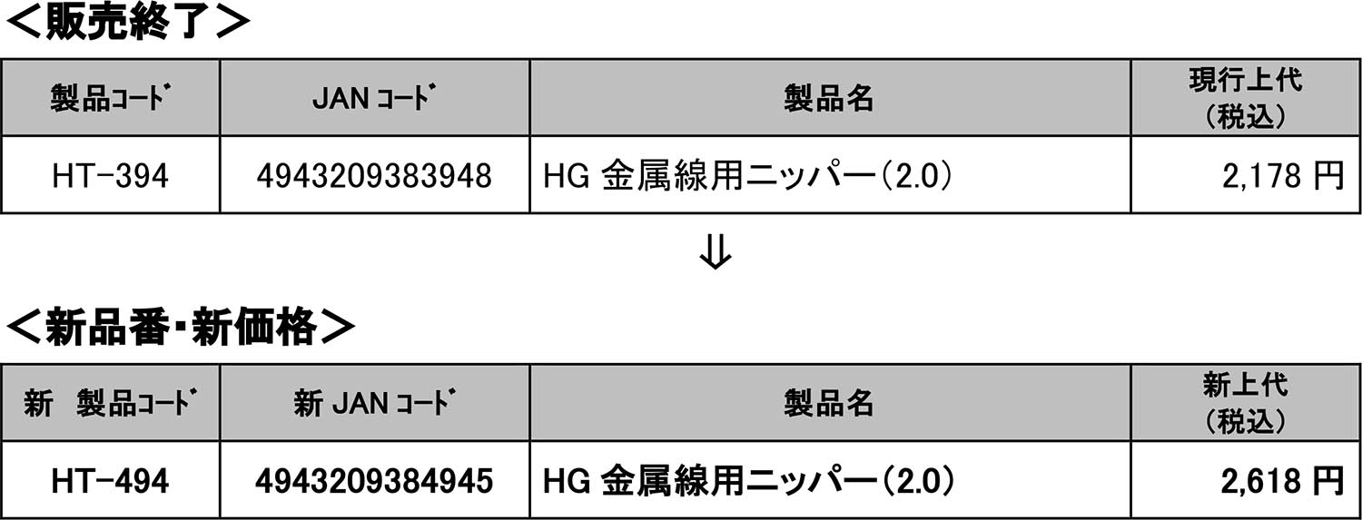 トップページ > お知らせ > HG金属線用ニッパー(2.0)価格改定のお知らせ