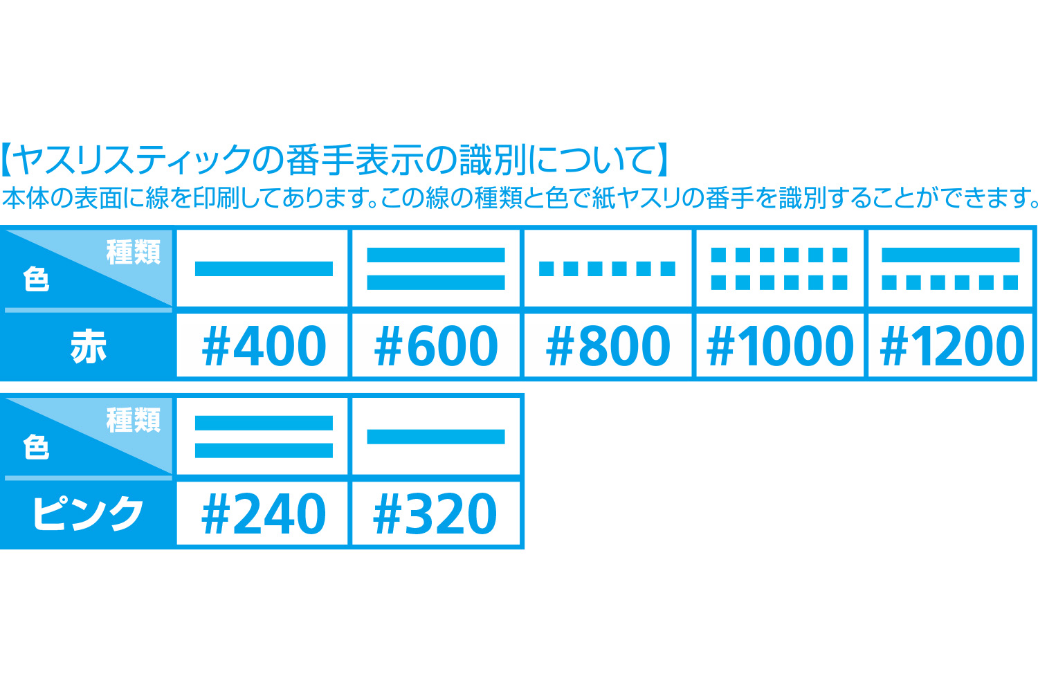 ■識別ライン:ピンク(#240、#320)/赤(#400〜#1200)