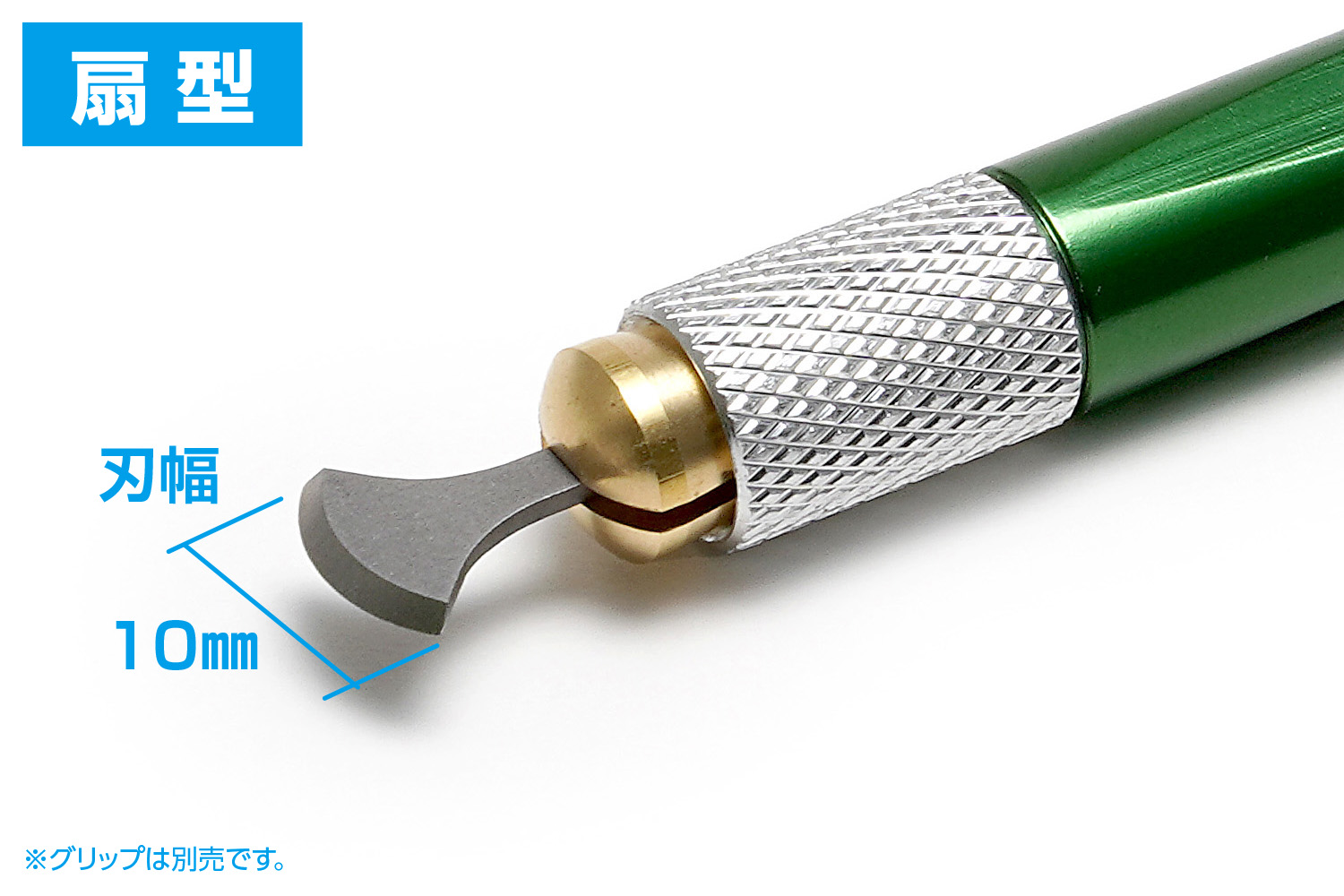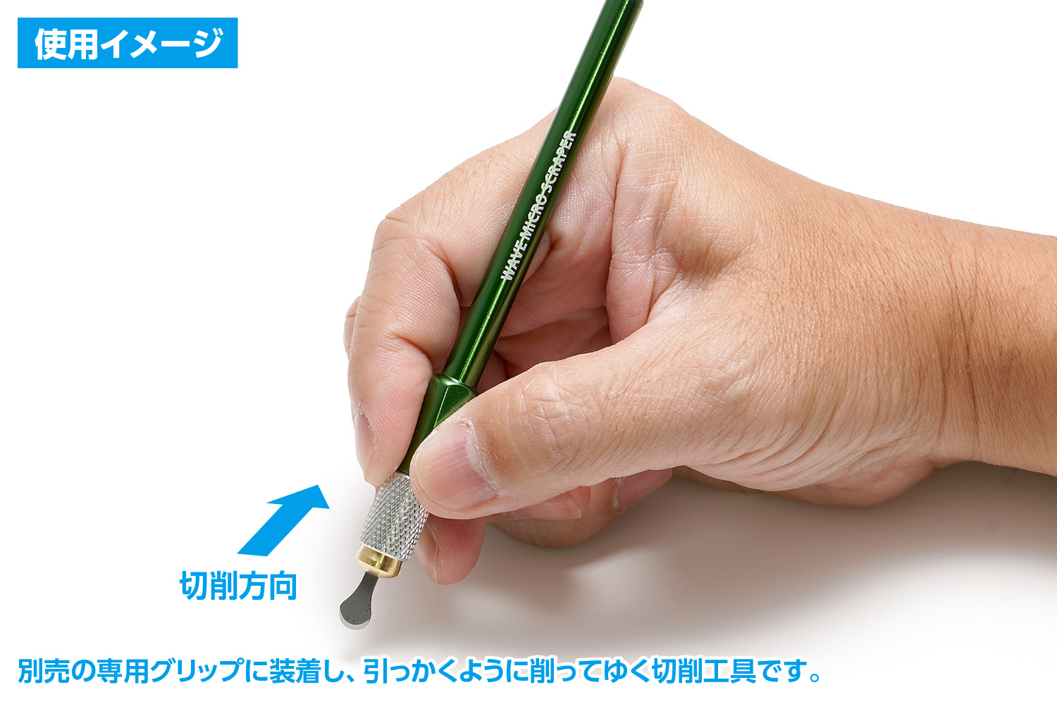 本製品のご使用には別売の「HGマイクロスクレーパーセット」のグリップ(緑)や「HGマイクロチゼル専用グリップ」に装着する必要があります。